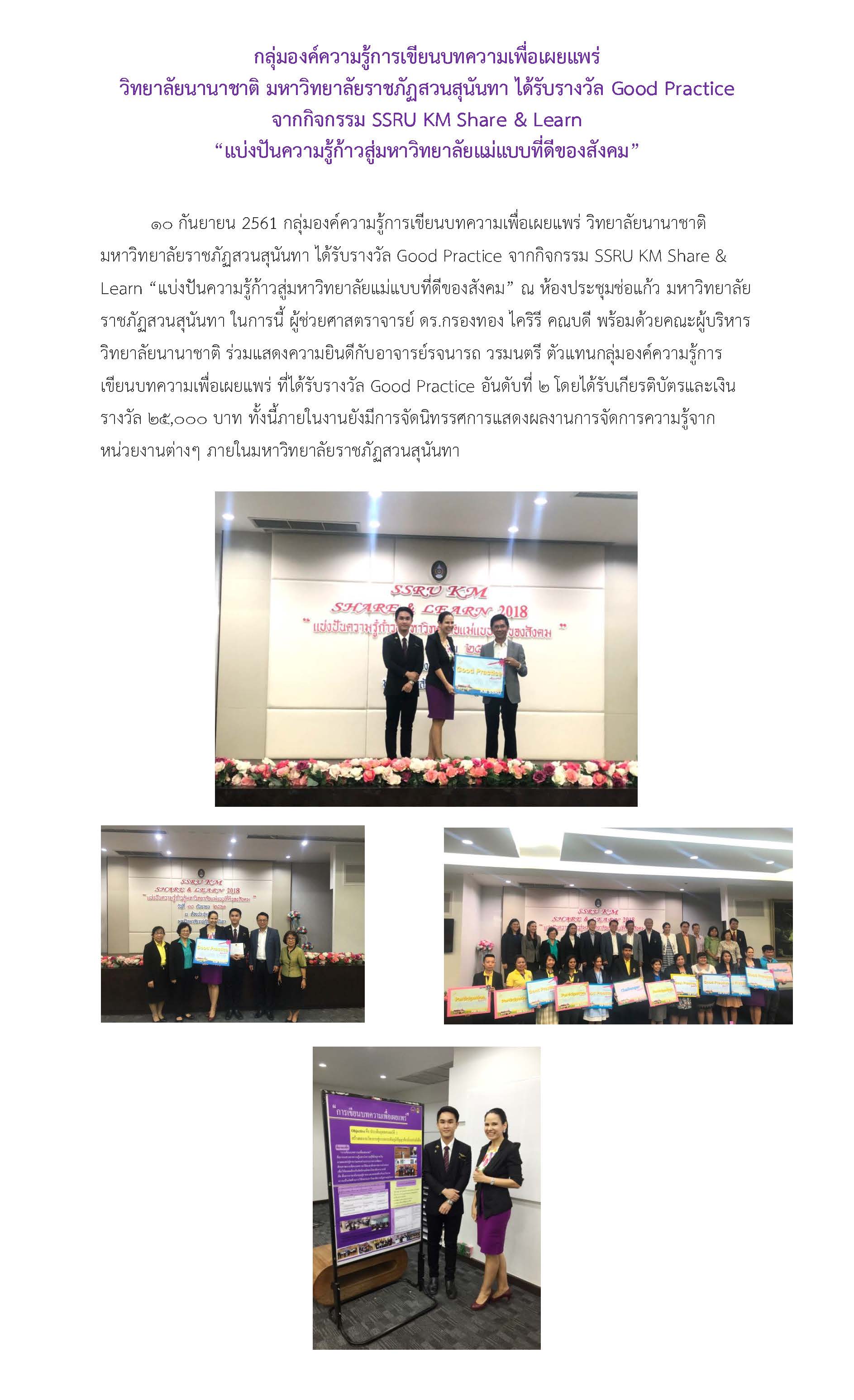 Download PDF Knowledge Group to write articles for publishing. International College Suan Sunandha Rajabhat University won the Good Practice Award From SSRU Activities KM Share & Learn "Share your knowledge to the good universities of society."