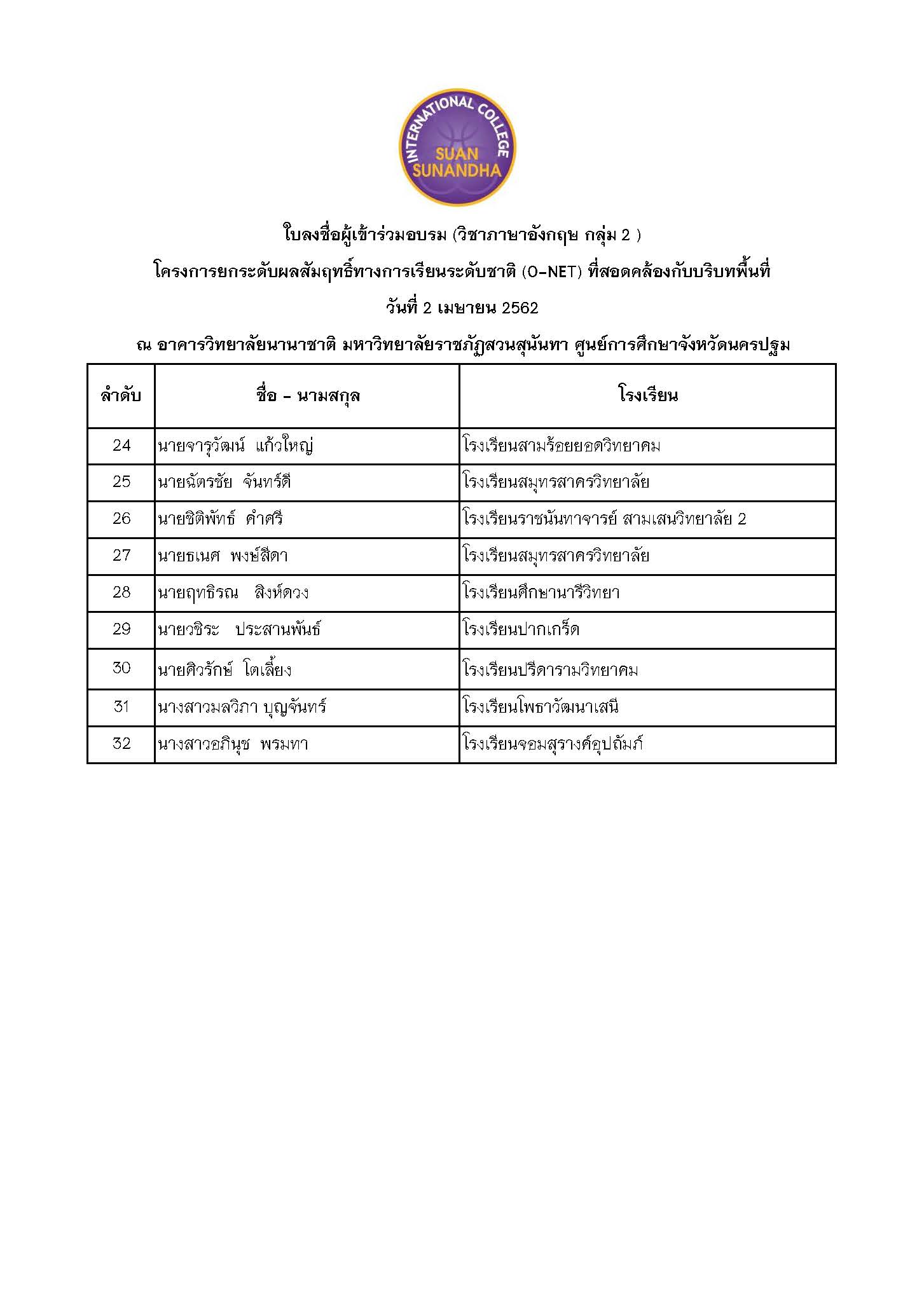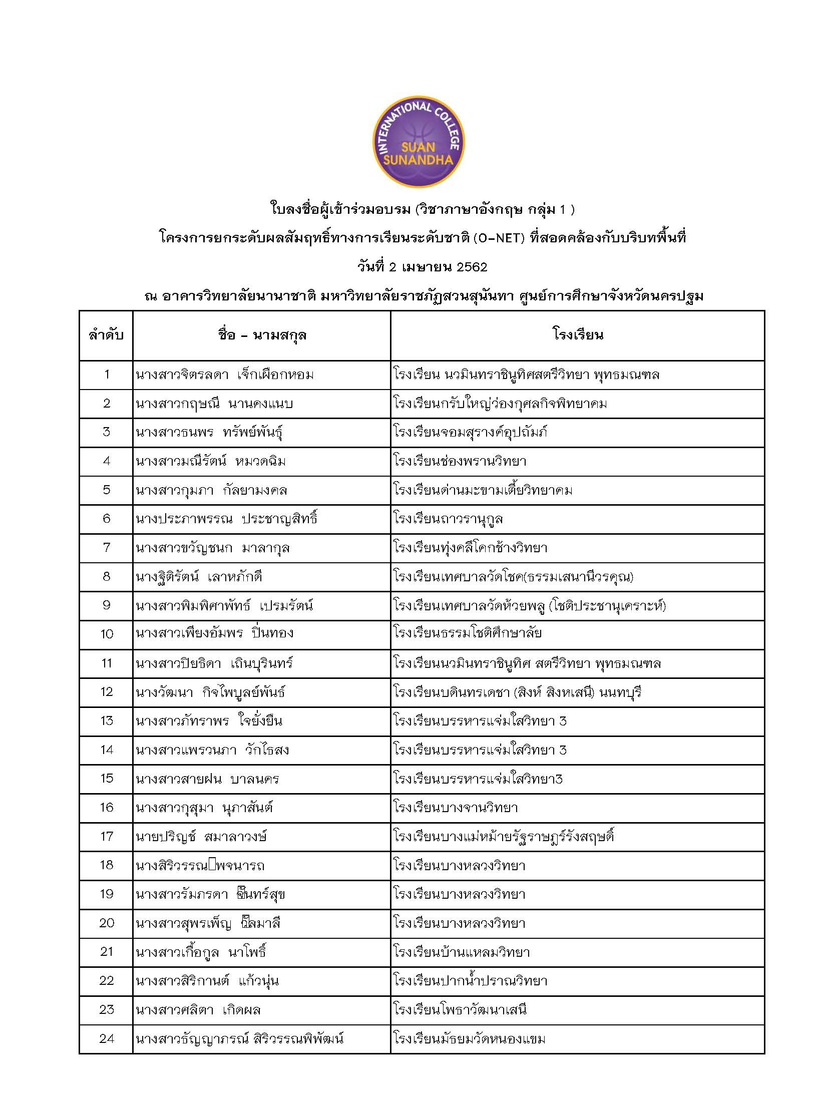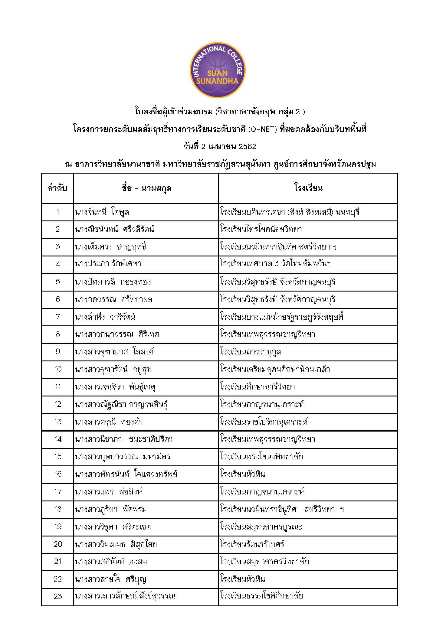 ประกาศรายชื่อผู้เข้าร่วมอบรมแบบแบ่งกลุ่ม โครงการยกระดับผลสัมฤทธิ์ทางการเรียนระดับชาติ (O-NET) ที่สอดคล้องกับบริบทพื้นที่ ณ วิทยาลัยนานาชาติ มหาวิทยาลัยราชภัฏสวนสุนันทา ศูนย์การศึกษาจังหวัดนครปฐม วิชา ภาษาอังกฤษ
