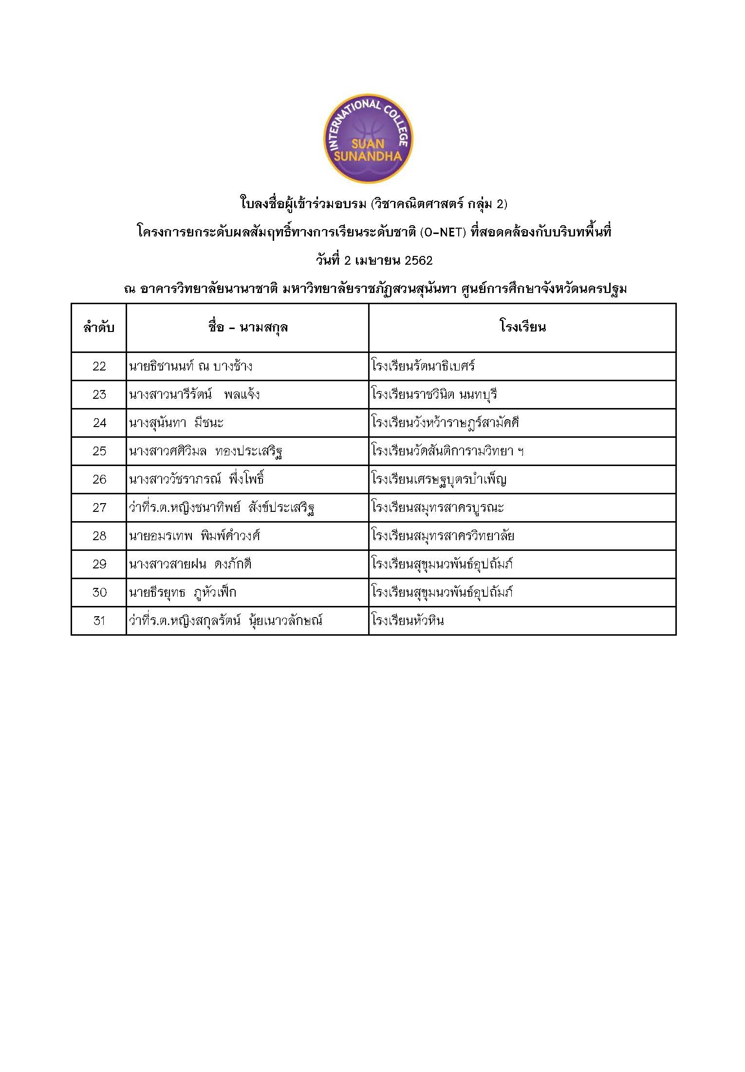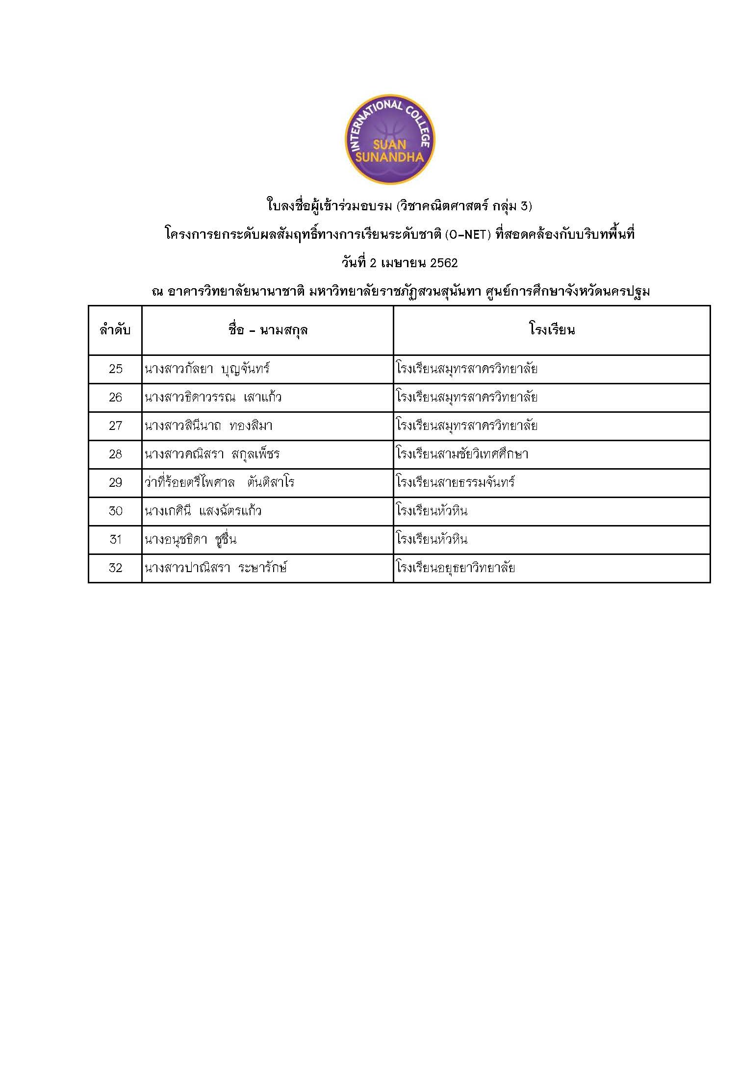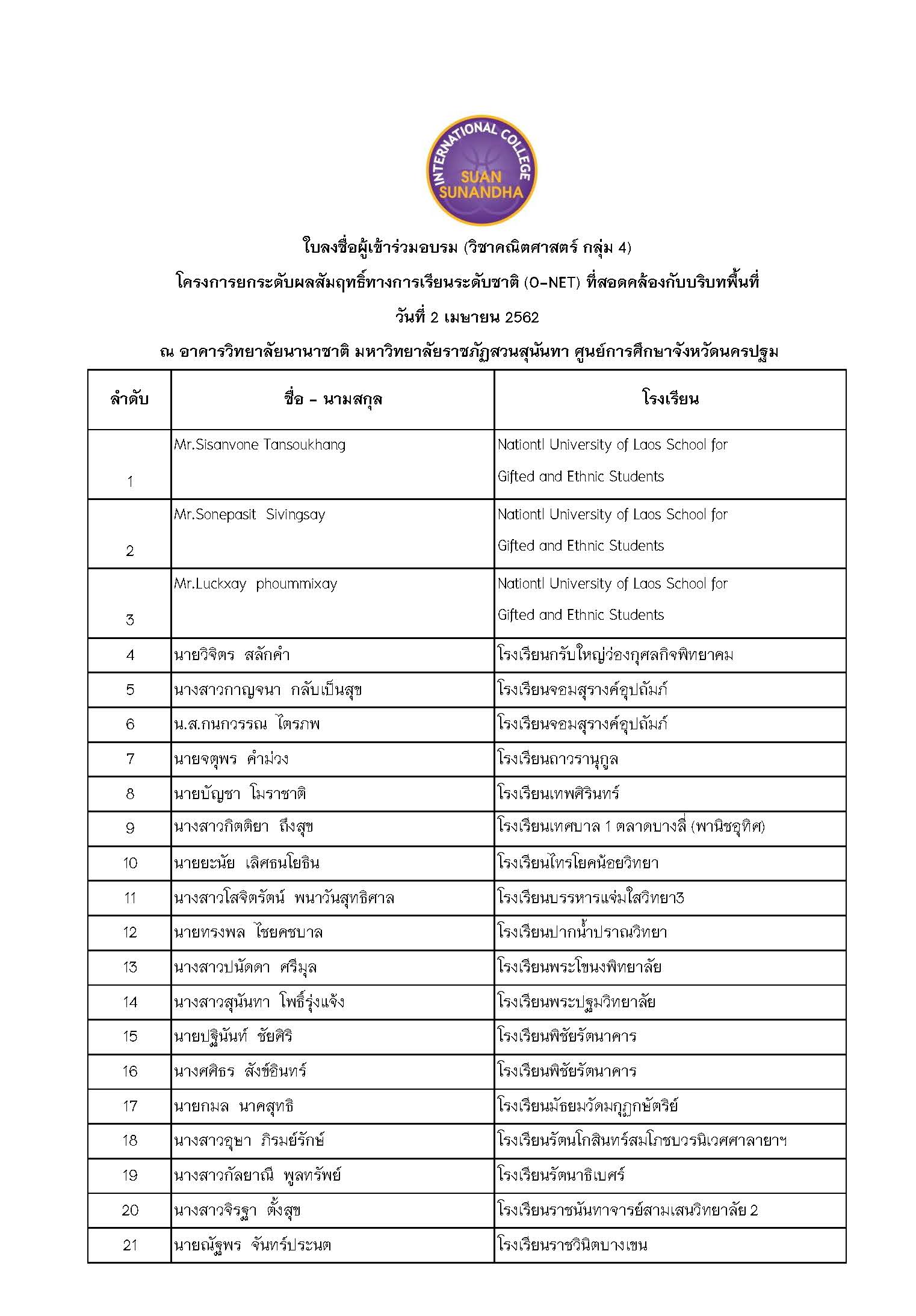 ประกาศรายชื่อผู้เข้าร่วมอบรมแบบแบ่งกลุ่ม โครงการยกระดับผลสัมฤทธิ์ทางการเรียนระดับชาติ (O-NET) ที่สอดคล้องกับบริบทพื้นที่ ณ วิทยาลัยนานาชาติ มหาวิทยาลัยราชภัฏสวนสุนันทา ศูนย์การศึกษาจังหวัดนครปฐม วิชา คณิตศาสตร์