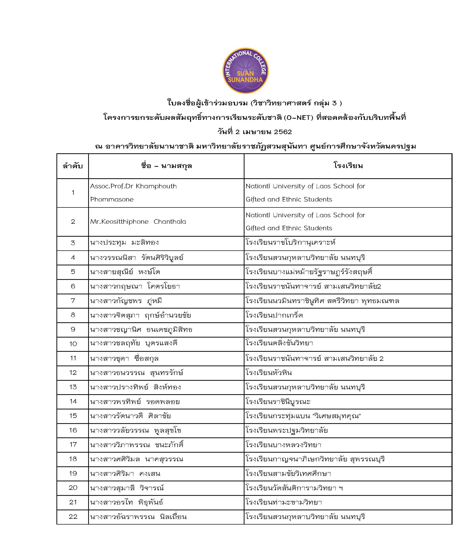 ประกาศรายชื่อผู้เข้าร่วมอบรมแบบแบ่งกลุ่ม โครงการยกระดับผลสัมฤทธิ์ทางการเรียนระดับชาติ (O-NET) ที่สอดคล้องกับบริบทพื้นที่ ณ วิทยาลัยนานาชาติ มหาวิทยาลัยราชภัฏสวนสุนันทา ศูนย์การศึกษาจังหวัดนครปฐม วิชา วิทยาศาสตร์
