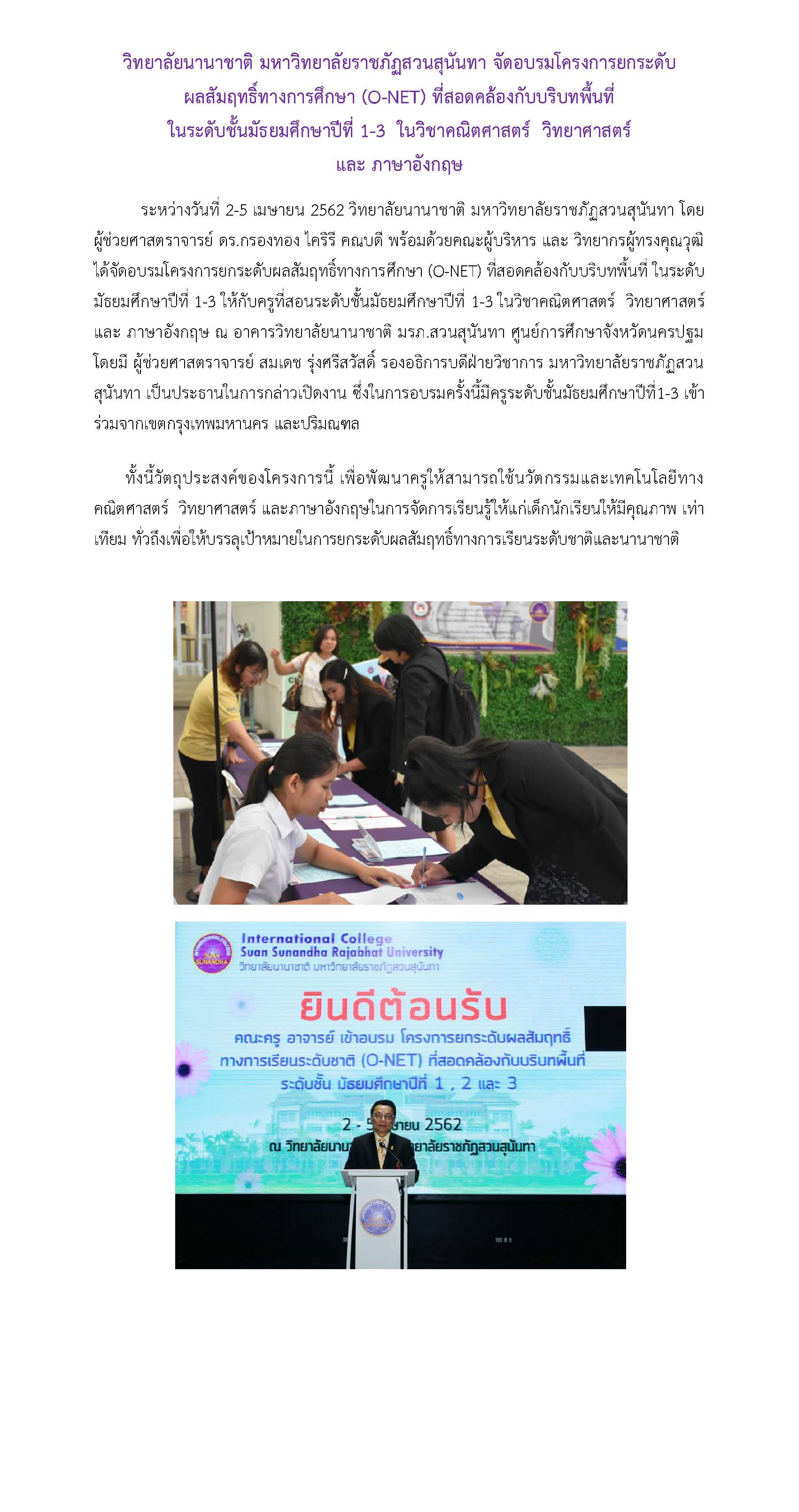 Download PDF วิทยาลัยนานาชาติ มหาวิทยาลัยราชภัฏสวนสุนันทา จัดอบรมโครงการยกระดับผลสัมฤทธิ์ทางการศึกษา (O-NET) ที่สอดคล้องกับบริบทพื้นที่ ในระดับชั้นมัธยมศึกษาปีที่ 1-3 ในวิชาคณิตศาสตร์ วิทยาศาสตร์ และ ภาษาอังกฤษ.pdf