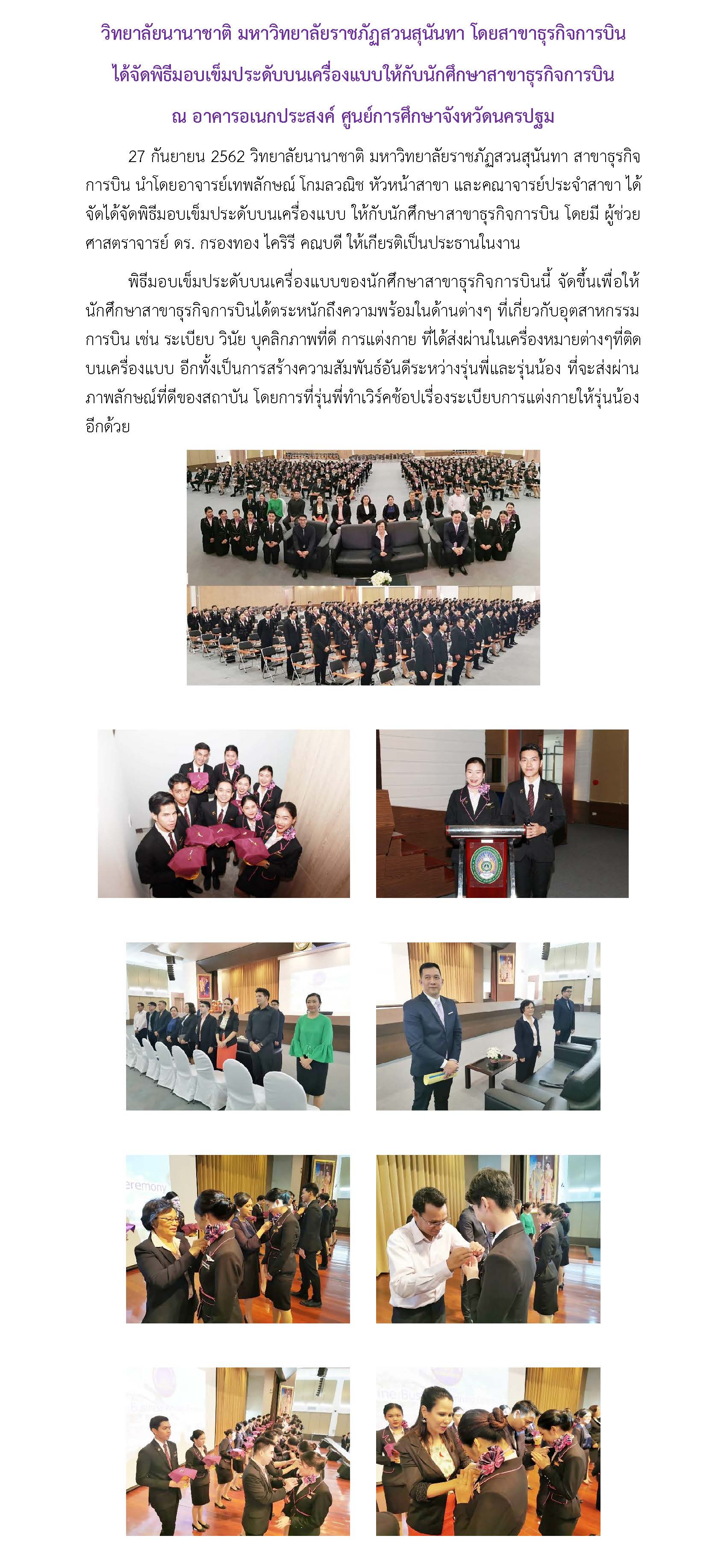 Download PDF วิทยาลัยนานาชาติ มหาวิทยาลัยราชภัฏสวนสุนันทา โดยสาขาธุรกิจการบิน ได้จัดพิธีมอบเข็มประดับบนเครื่องแบบให้กับนักศึกษาสาขาธุรกิจการบิน ณ อาคารอเนกประสงค์ ศูนย์การศึกษาจังหวัดนครปฐม