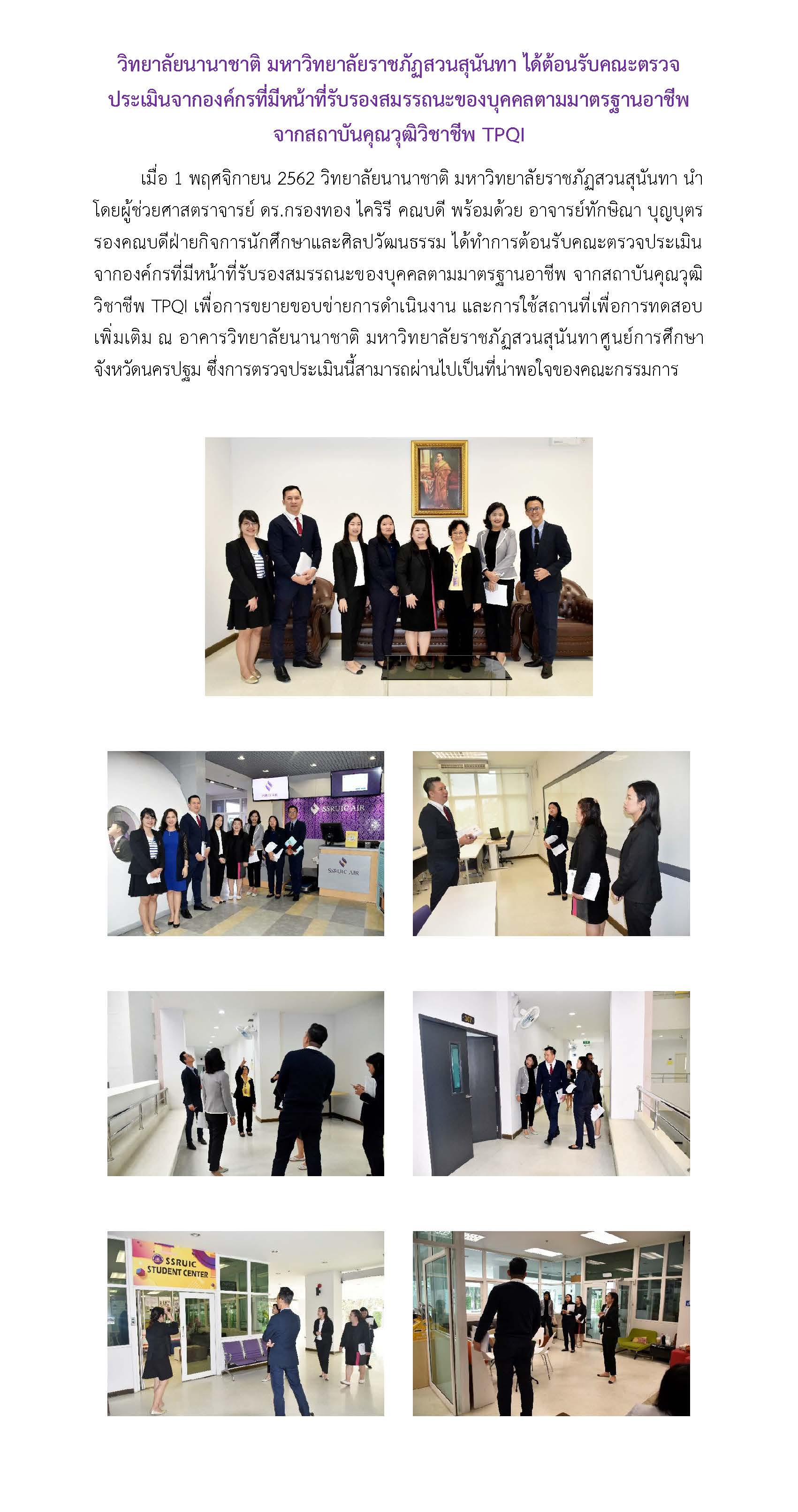 Download PDF วิทยาลัยนานาชาติ มหาวิทยาลัยราชภัฏสวนสุนันทา ได้ต้อนรับคณะตรวจประเมินจากองค์กรที่มีหน้าที่รับรองสมรรถนะของบุคคลตามมาตรฐานอาชีพ จากสถาบันคุณวุฒิวิชาชีพ TPQI