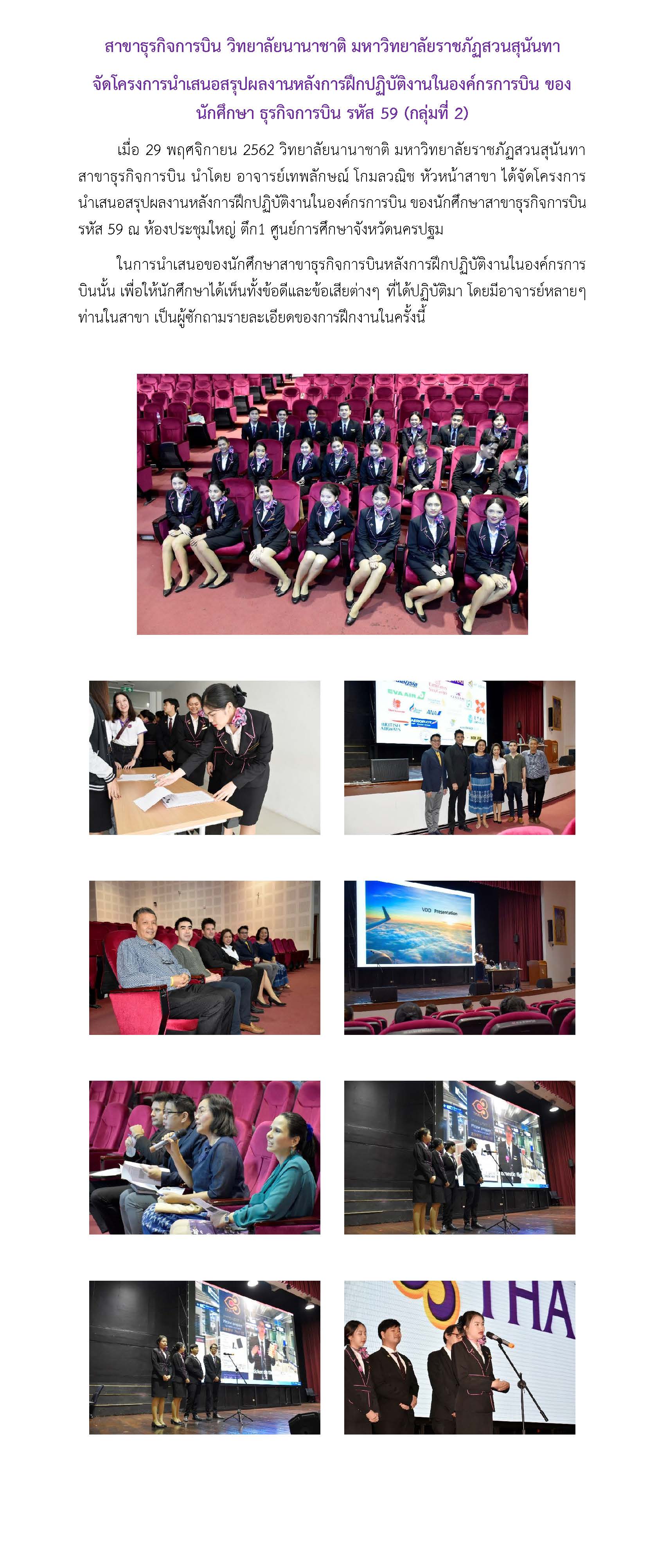 Download PDF สาขาธุรกิจการบิน วิทยาลัยนานาชาติ มหาวิทยาลัยราชภัฏสวนสุนันทา จัดโครงการนำเสนอสรุปผลงานหลังการฝึกปฏิบัติงานในองค์กรการบิน ของนักศึกษา ธุรกิจการบิน รหัส 59 (กลุ่มที่ 2)
