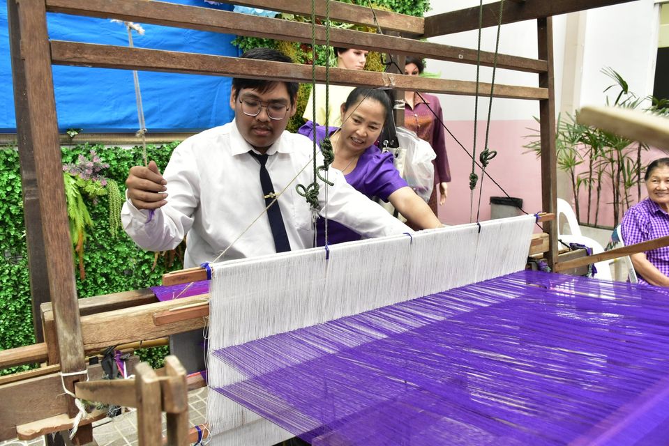 พร้อมกับสาธิตการมัดย้อมและการทอผ้าโดยใช้เครื่องกี่กระตุก